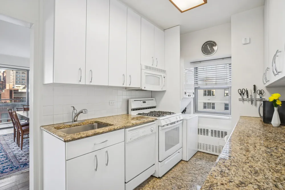 The windowed kitchen has all modern appliances and ample storage, as well as a stacked washer & dryer.