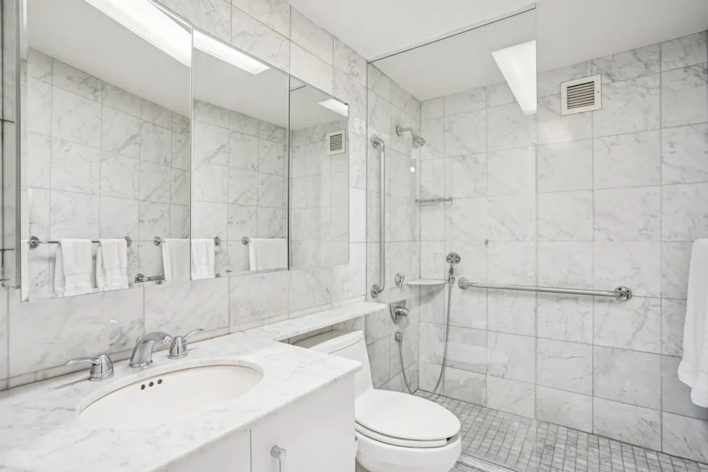 The enormous corner primary bedroom has oversized bay windows, and excellent closet space. The two bathrooms have glass-enclosed shower stalls, and are clad in marble tile.