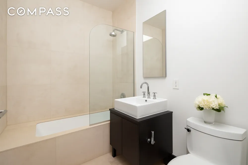 The desirable split-bedroom layout begins with a serene primary suite featuring a king-size bedroom. An oversized walk-in closet/dressing room leads to the en suite primary bathroom, where a soaking tub and shower are surrounded by floor-to-ceiling tile. Off the living room, pocket doors reveal a huge secondary suite with a private bathroom and two closets, including a walk-in. An in-unit washer-dryer and central HVAC add comfort and convenience to this fantastic Flatiron sanctuary.
