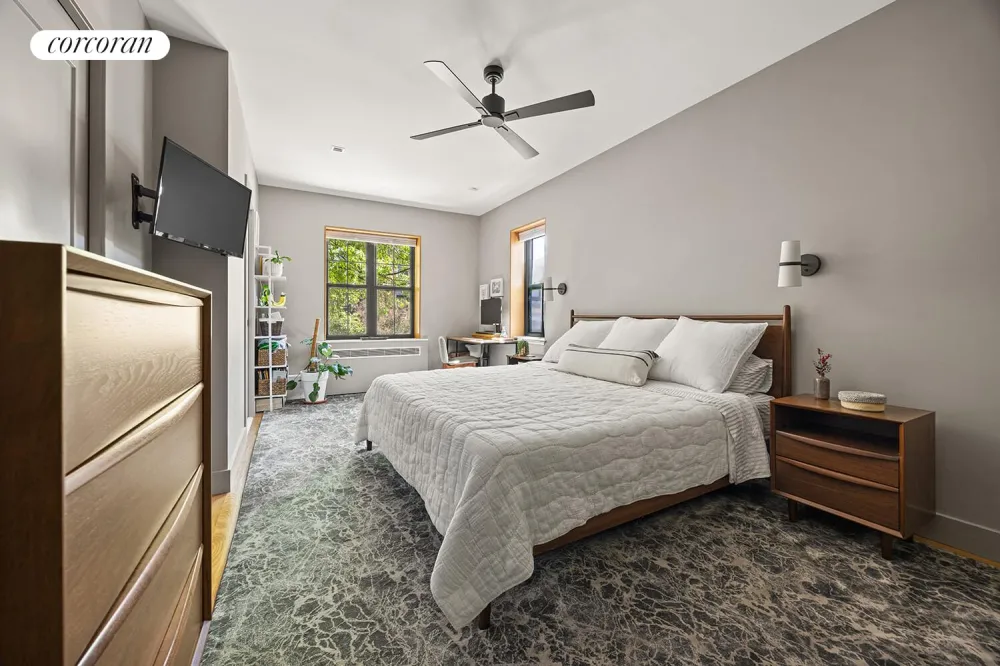 The glorious Art Deco co-op building that is 230 Park Place -- in PRIME Prospect Heights -- now offers a meticulously gut-renovated two-bed, two-bath apartment. Stripped to its ribs, this apartment was reimagined and rebuilt with both integrity and style. The capacious layout of over 1,300 sq.ft. offers endless possibilities for furniture arrangement (bring on the biggest sectional and TV!). Enter 2J: two closets and space for a bench to put on or take off shoes, drop mail, and regroup before coming or going. The sunken living room has built-in shelves and cabinets flanking its double bay, as well as an area that works perfectly as a dedicated home office. The windowed galley kitchen is refined and functional, with ceiling-high Kraftmaid cabinets finished in a handsome marine blue with brushed chrome hardware; expansive Quartzite countertops; and a suite of Bosch & GE appliances, including an electric double oven. The adjacent dining area easily seats six with chairs and/or a banquette. Two oversized bedrooms are set off from the common areas for privacy and serenity. The primary suite has a pristine bathroom with a marble-topped vanity, heated floors and step-in shower, and a fully outfitted walk-in designed by California Closet. The guest bath also has a marble-topped vanity, as well as a tub and shower. The apartment has four additional closets, refinished white oak floors, new windows in stained white oak with marble sills, and pristine skim-coated walls.