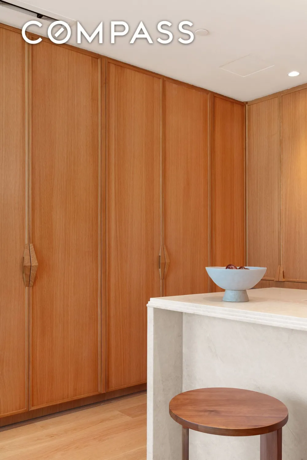 Inside, AD100 Workstead’s interiors blend natural textures and sculptural warmth. The kitchen features custom white-oak cabinetry, a honed Taj Mahal quartzite waterfall island, and integrated Thermador appliances, complemented by a custom wet bar in China White stone and bronze. The primary suite evokes spa-like serenity with honed Crema Vanilla marble, radiant heated floors, and a deep soaking tub, while each secondary bath continues the tone of quiet luxury.