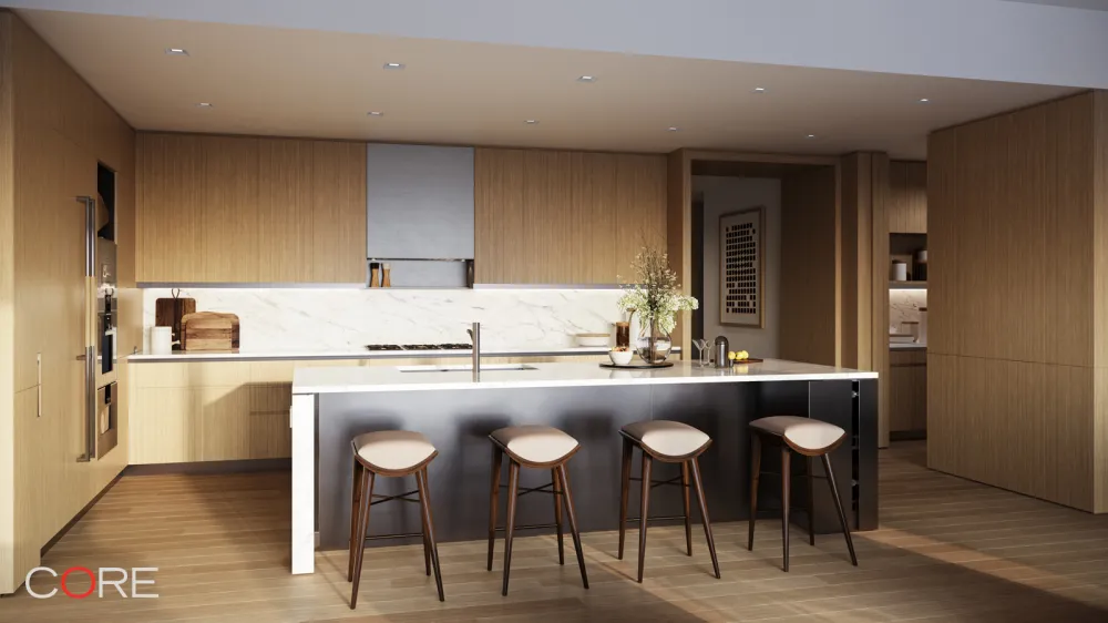 Residence 11FE is 835 SF with one bedroom and one bathroom. The expansive, open-plan living and dining areas feature a south exposure, a kitchen with a custom Olson Kundig-designed Jackbox, warm wood flooring, and floor-to-ceiling windows.