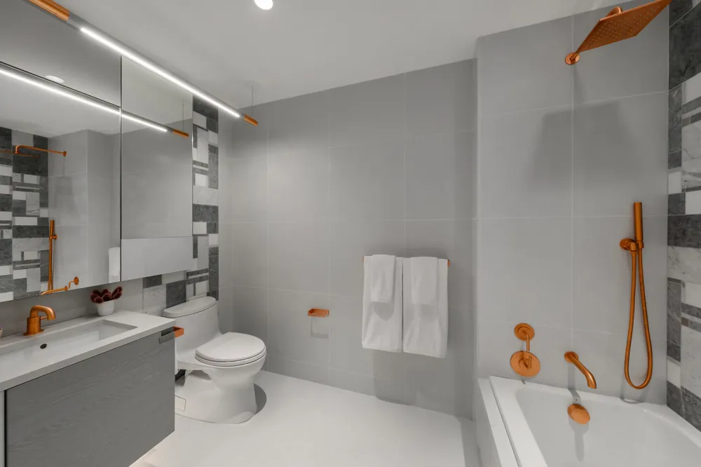 A pristine corner residence nestled in the prestigious Brooklyn Point development, this stunning 2-bedroom, 2-bathroom home is a portrait of contemporary Brooklyn living. Features of this 1,185 sq. ft. home include beautiful wide plank stained oak floors, floor-to-ceiling windows with southern and eastern exposure and panoramic views of Brooklyn, an in-home washer/dryer, and a harmonious dark wood color palette with satin copper fixtures and finishes designed to accentuate space and natural light.