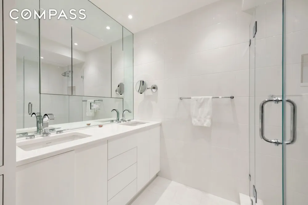 Head to the primary suite to discover king-size proportions, a walk-in closet and an en suite bathroom with a glass shower, double vanity and floor-to-ceiling tile. A south-facing secondary bedroom offers a reach-in closet and easy access an adjacent walk-in and full bathroom. A full guest bathroom, an in-unit washer and vented dryer add convenience to this sprawling Lenox Hill haven.