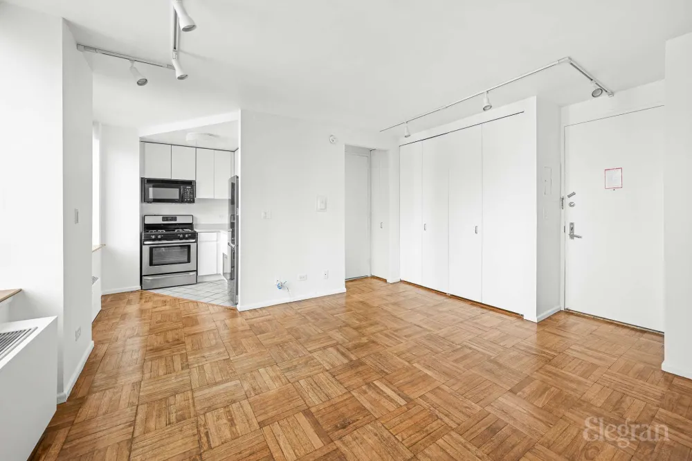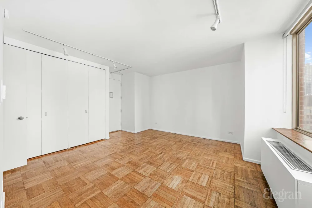 Perched on the 33rd floor, this bright and thoughtfully designed studio offers breathtaking panoramic views of the city skyline and East River through two oversized windows that span nearly an entire wall. The well-proportioned layout maximizes its space, featuring oak newly refinished parquet floors and excellent natural light throughout.