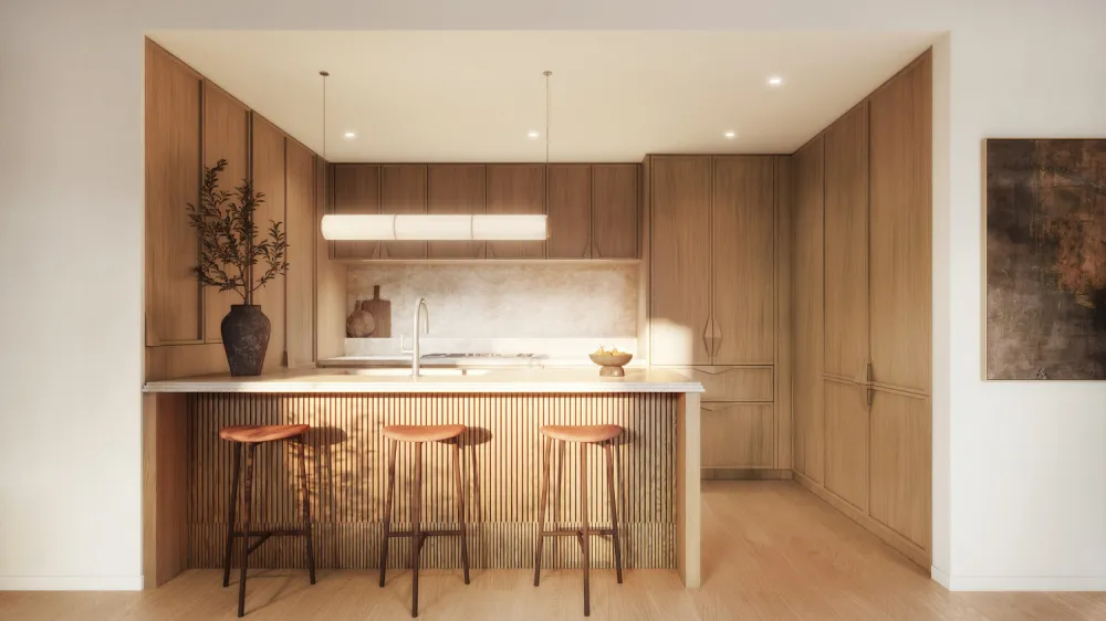 Designed by AD100 firm Workstead, the interiors embrace simplicity as a form of luxury-combining natural materials, craftsmanship, and balance to create a calming retreat. The kitchen showcases custom white oak cabinetry and hardware, paired with a honed Taj Mahal quartzite countertop, backsplash, and ledge. A fully integrated Bosch appliance suite complements the design's refined minimalism, allowing the textures and tones to take center stage.