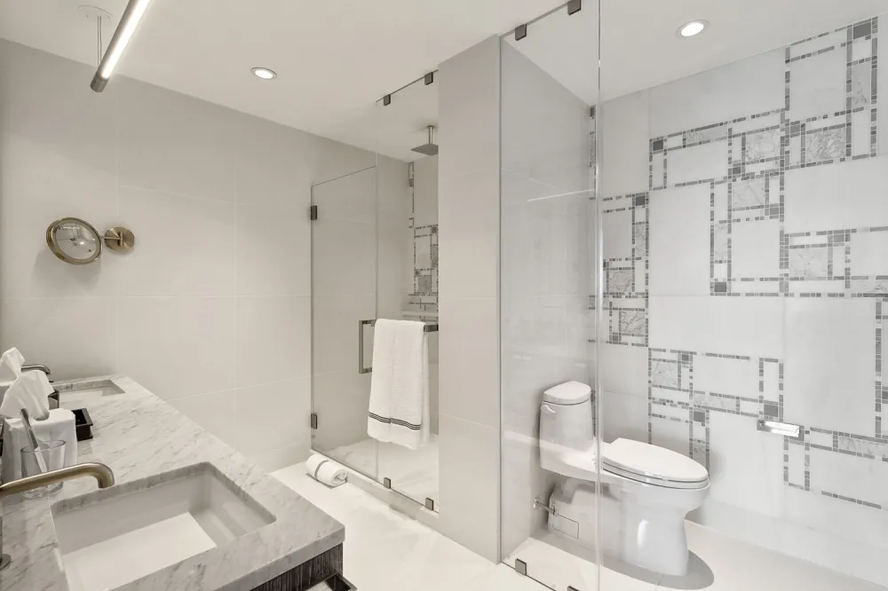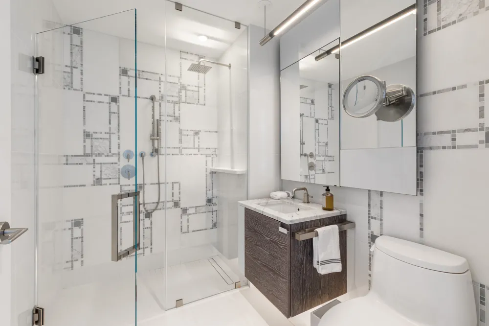 A thoughtful split-wing layout separates the primary and secondary bedrooms. The primary bedroom has a pair of reach-in closets and an immaculate en-suite bathroom with a floating double vanity, imported stone surfaces, custom Waterworks fixtures, a walk-in rain shower, and radiant heated floors. The second bedroom features a full en-suite bathroom, while the third bedroom has easy access to the home's third full bathroom.
