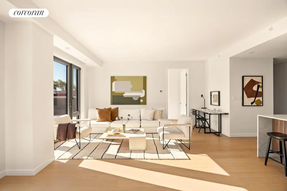 Unit 204 is the largest 2-bedroom line in the building. Situated on the corner with south, east and north exposures, oversized windows and an incredible kitchen, you are guaranteed amazing light all day long, and a wonderfully spacious layout that accommodates formal dining and a separate living room. An amazing 87 SF terrace is conveniently located off the living room for gracious indoor/outdoor living everyday.