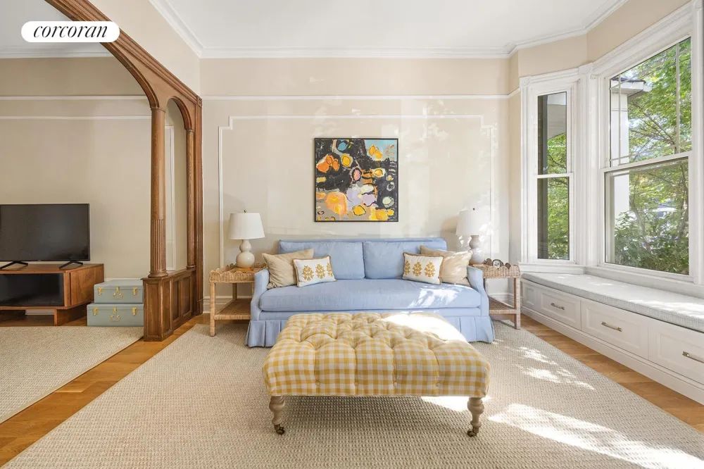 The double parlor at the front of the home is bathed in natural light from four bay windows. Original oak columns and arched doorways preserve historic character, while new white oak floors on the first level and refinished pine floors upstairs, including the staircase, add warmth and elegance. Thoughtful touches such as custom entry cabinetry and a window seat with drawers in the living room provide both charm and practical storage.