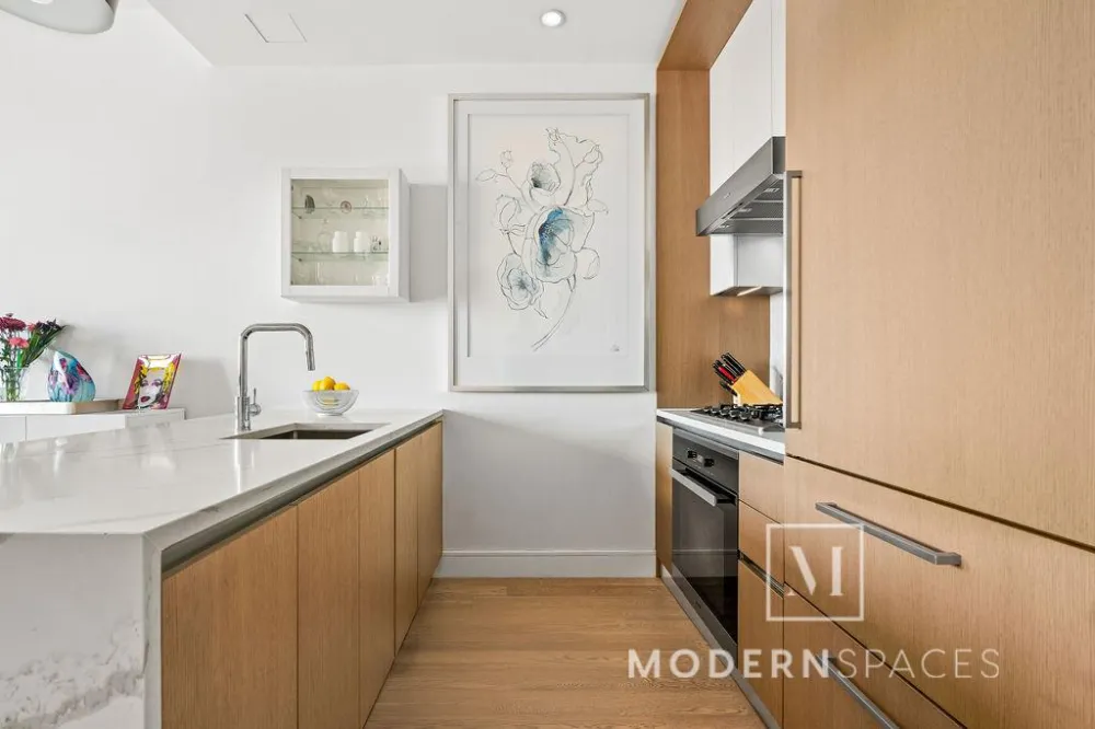 The sizable living area includes beautiful custom built-in entertainment and bookshelves from California Closets, along with wiring for a ceiling chandelier. Extending your entertaining space, the large 82 sq ft private balcony offers stunning views of the Manhattan skyline and the Queensboro Bridge. The modern kitchen is equipped with custom designer white oak cabinetry, quartz countertops with a waterfall edge and backsplash, and premium Miele appliances. The spacious bedroom comfortably accommodates a king-sized bed and additional furnishings, and includes a large closet with custom California Closets. The modern bathroom features elegant porcelain tiles, a large soaking tub with an upgraded built-in enclosed sliding glass door, and radiant heated floors. Additional amenities within the unit include a Miele washer/dryer, custom Shade Store smart blackout window treatments, and Smart Latch access to the apartment.