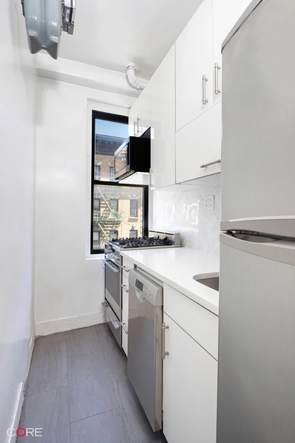 Welcome home to this renovated, cozy, north-facing, prewar studio apartment in a full-service building. The comfortable living space has a Murphy bed, a windowed kitchen with stainless steel appliances, including a Bosch dishwasher and Fisher and Paykel gas range. The windowed bathroom has been updated... See more