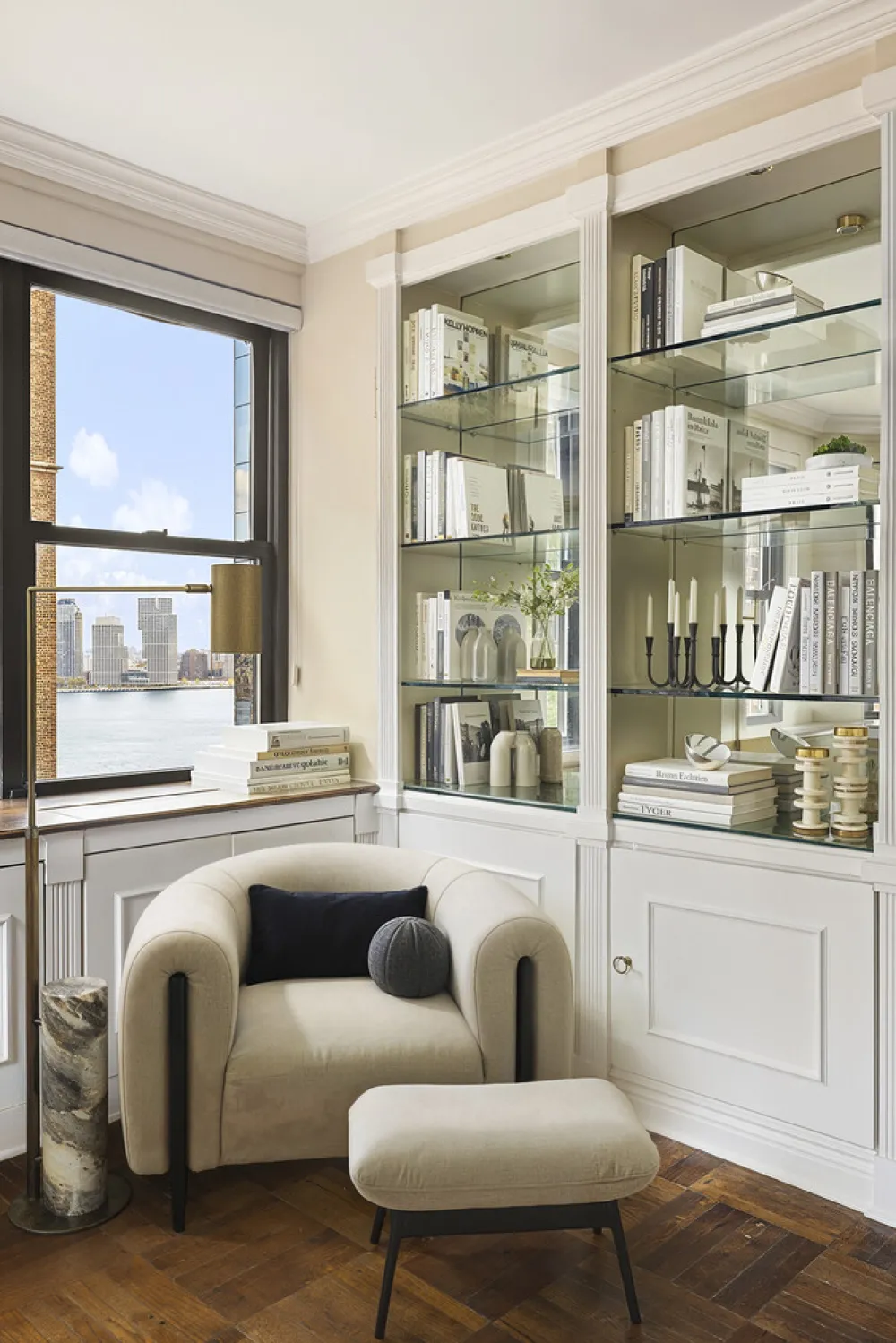 The living room is truly the heart of the home - an inviting space framed by breathtaking river and city views, ideal for relaxing or entertaining in style. The space also features built-in cabinetry and bookshelves to cater to your additional storage needs.