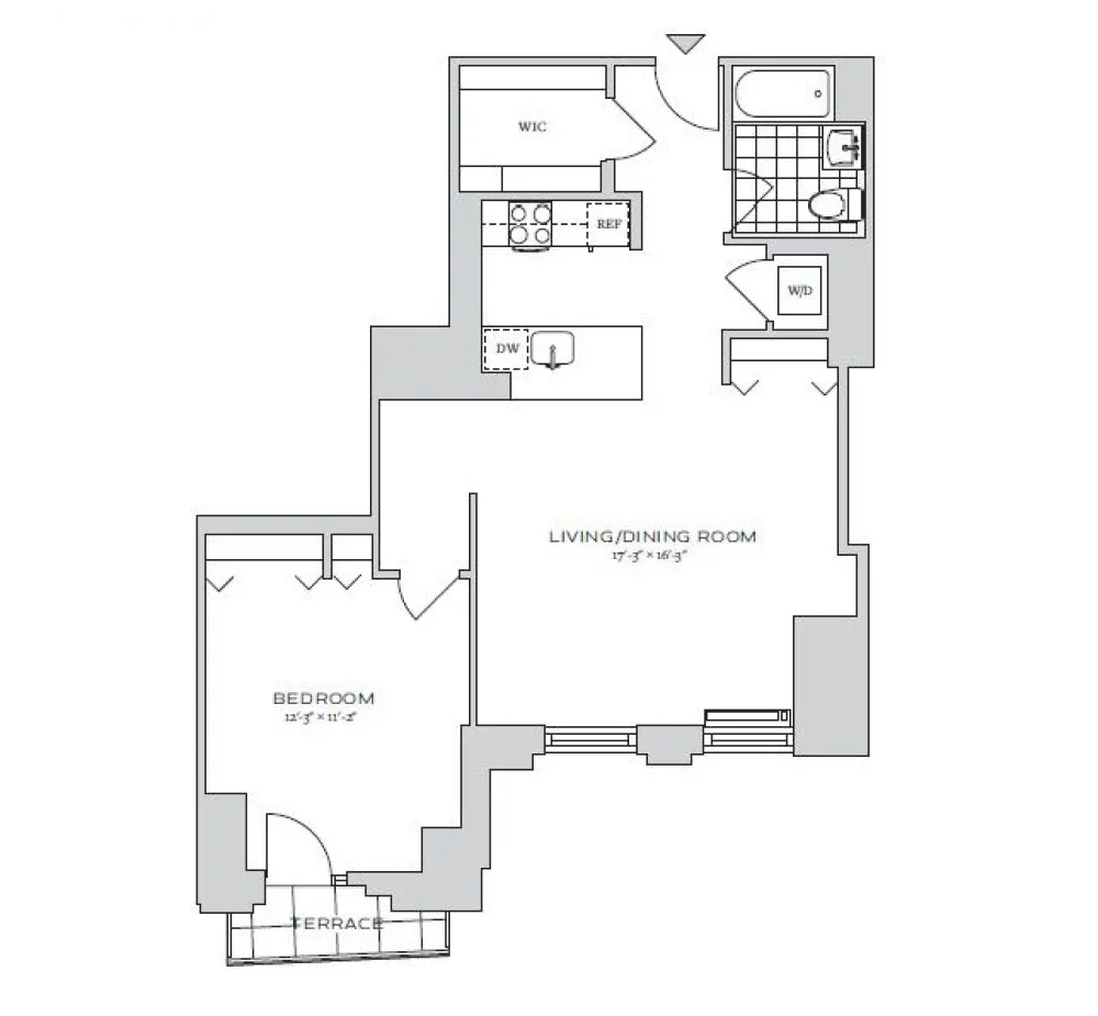 Unique one bedroom with a large living room, gourmet kitchen with stainless steel appliances and stone countertops, private terrace from the bedroom, high ceilings, large walk-in closet, in-unit washer/dryer, and wood floors throughout.