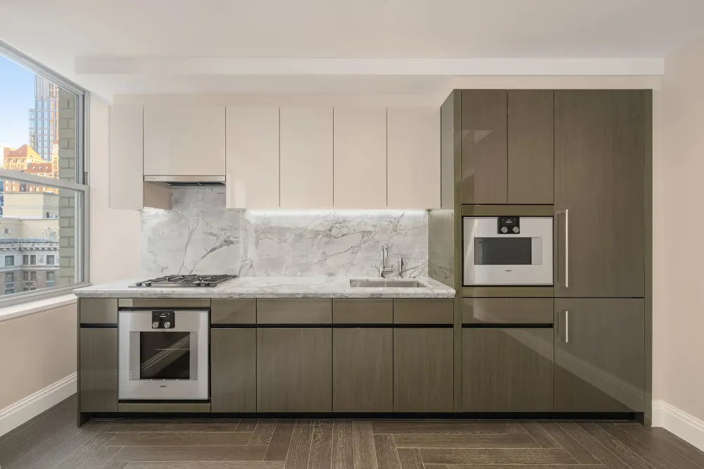 The open-concept kitchen and living area is bathed in natural light and features custom Molteni&C cabinetry, Gaggenau appliances, a four-burner gas cooktop, Polished Quartzite Arabescato countertops, and polished nickel fixtures.