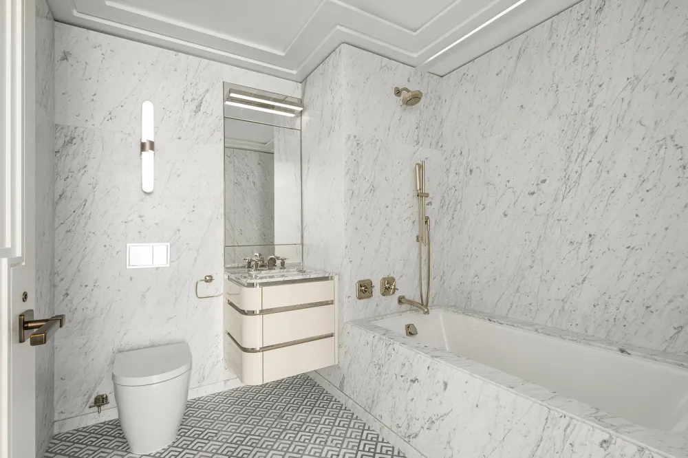 The primary bathroom is a sanctuary of luxury with Bianca Carrara marble slab walls, radiant-heated mosaic marble floors, and a custom vanity with Luna Gray marble countertop. Fixtures are custom forged in polished nickel, exclusive to the Waldorf Astoria Residences.