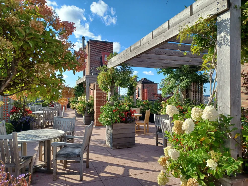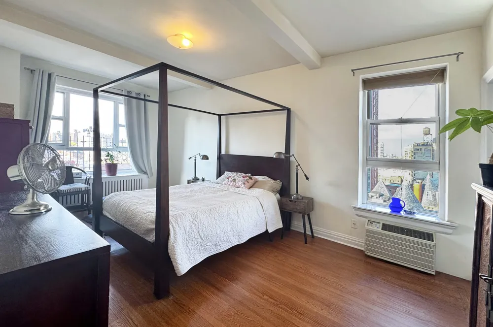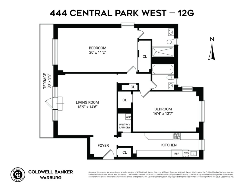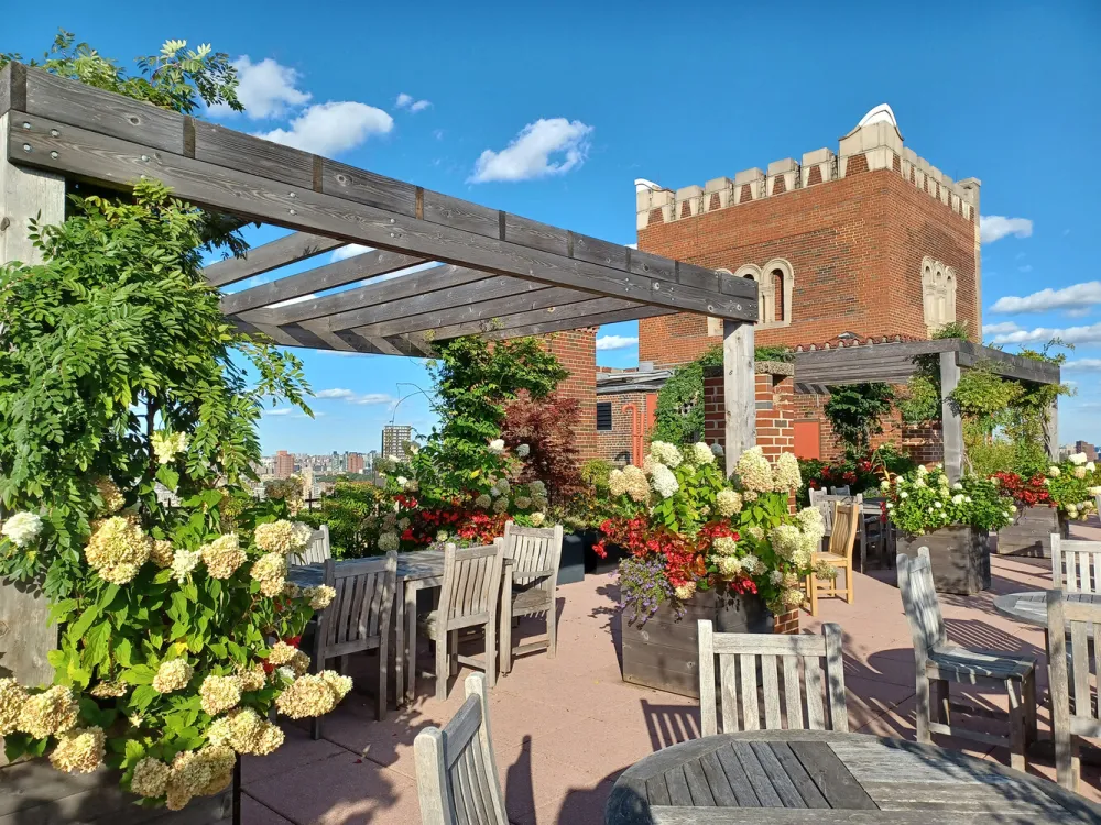 The apartment features generous room sizes, oak hardwood floors, high beamed ceilings, and five closets. A small foyer opens to a large, west-facing living room easily accommodating both dining and seating areas, and an adjacent 30-foot terrace perfect for morning coffee, evening cocktails, or an urban garden.