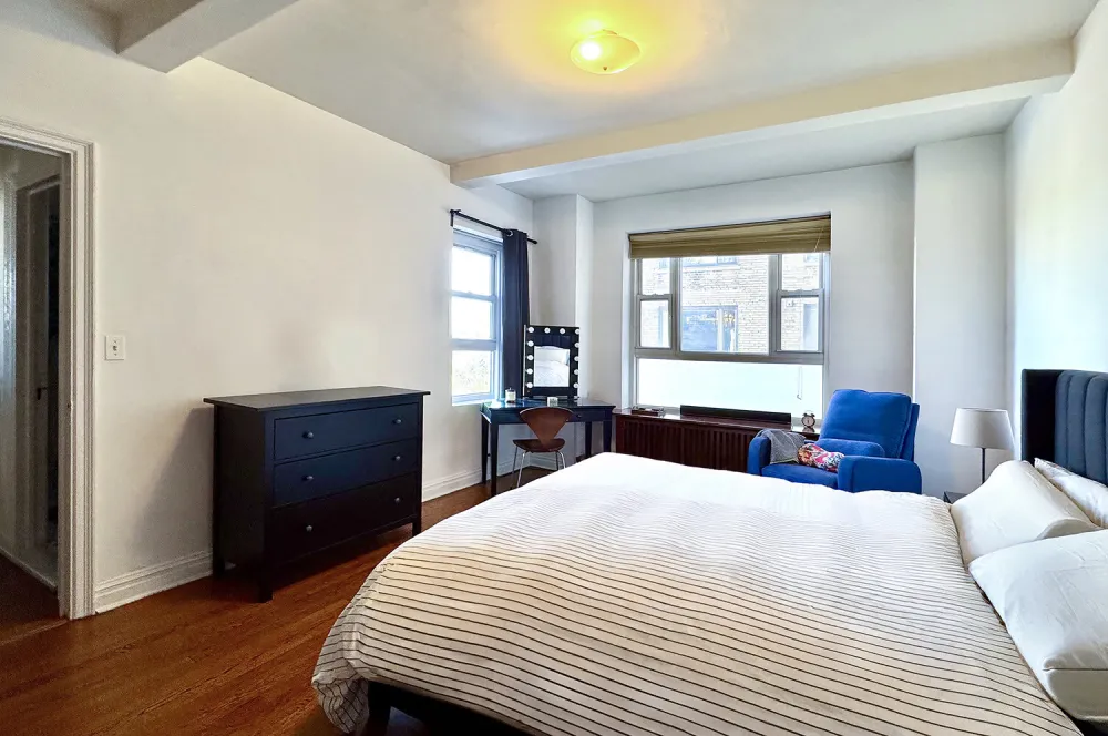 The windowed kitchen is fully equipped, with granite counters, good storage, a dishwasher, and an in-unit washer/dryer. A short hallway separates the bedrooms for privacy. The primary bedroom offers open west and north exposures, California closets, and a renovated en-suite bath. The second bedroom has two exposures, north and east, and the hall bath is conveniently located for guests.