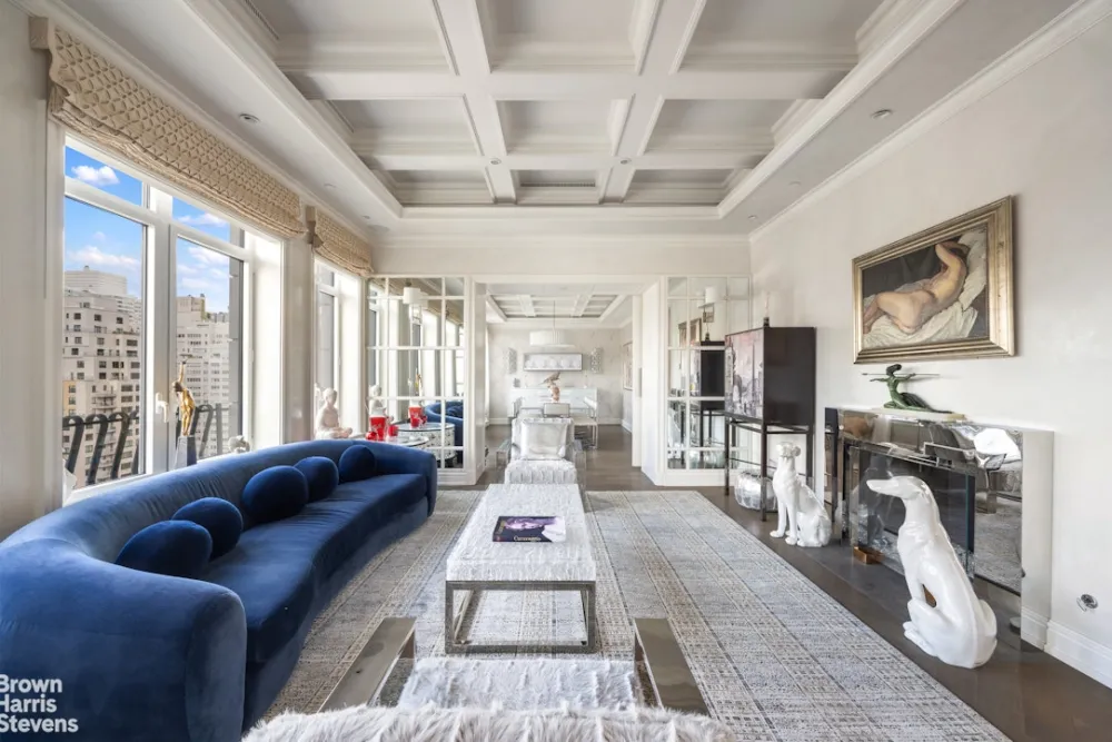 Featuring 50 linear feet across the den, living, and dining rooms, coupled with a ceiling height of nearly 11 feet, the main floor enjoys stunning views to the north, east, as well as west toward Central Park. A gourmet kitchen features honed Italian Calacatta marble, several Gaggenau appliances, and a beautiful windowed eat-in, breakfast area. The refrigerator and wine fridge are by Subzero. The main floor also boasts a den, which can serve as a guest room, complete with an ensuite windowed bathroom, and a fantastic powder room.