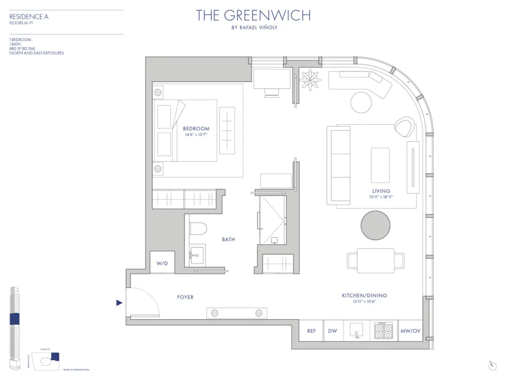 Introducing Residence 71A at The Greenwich by Rafael Vinoly, a north and east facing one bedroom, showcasing sweeping panoramas of the Manhattan Skyline and the East River. Indulge yourself in the awe-inspiring views visible through floor-to-ceiling windows, where ceiling heights extend beyond 10 feet, presenting an ever-evolving vista of the city skyline and waterfront. With 880 square feet of living space, this home offers meticulously designed living areas, featuring interior finishes crafted by the esteemed design firm, MAWD.