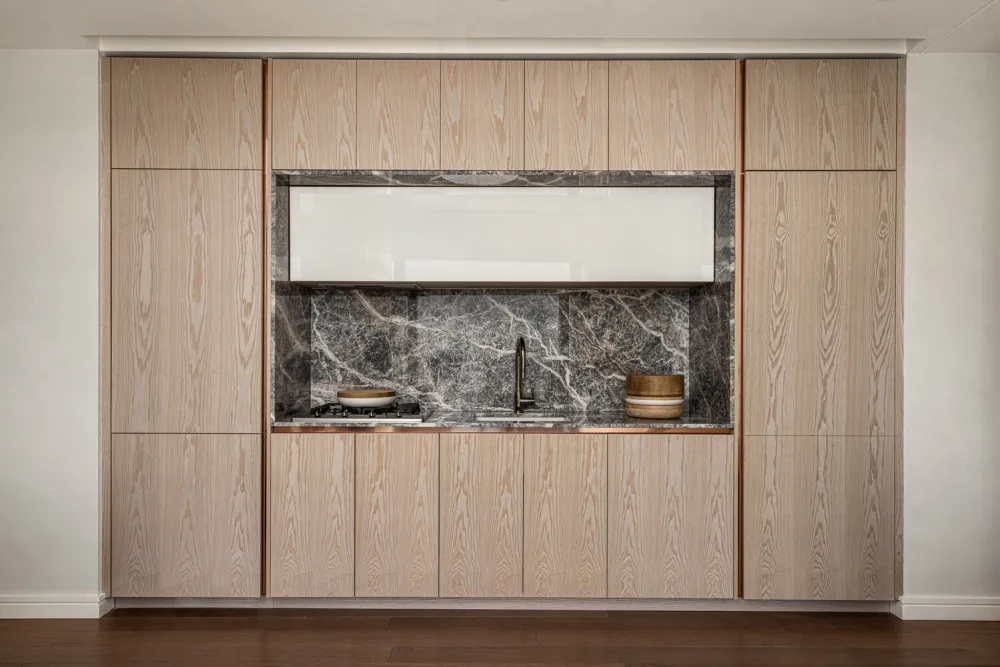 The formal entry foyer opens to the gracious living space, lined with 6" wide white oak flooring in light beige finish. The custom designed kitchen features a full suite of Miele appliances, including a vented hood, polished nickel fixtures, cabinets in light beige finish, and Fior di Pesco Carnica marble countertops and backsplash.