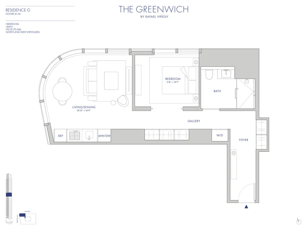 Residence 63G at The Greenwich by Rafael Vinoly is a 752 square foot one-bedroom, one bathroom with north and west exposures, allowing for an abundance of natural light and enjoyable sunsets over the Hudson River through curved floor-to-ceiling windows. This residence presents meticulously crafted interiors by the esteemed design firm, MAWD.