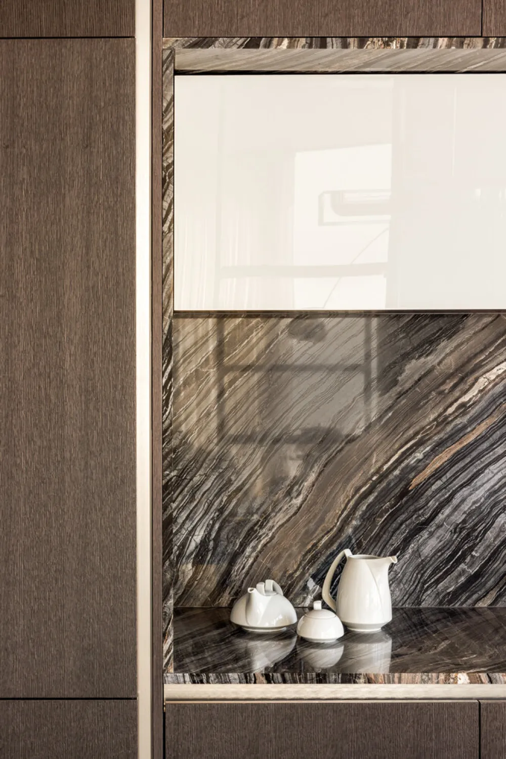 The formal entry foyer opens to the gracious living space, with 6" wide white oak flooring in dark brown finish. The custom designed kitchen features a full suite of Miele appliances, a vented hood, polished nickel fixtures, cabinets in walnut finish, and Ombra di Caravaggio marble countertops and backsplash.