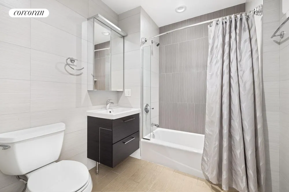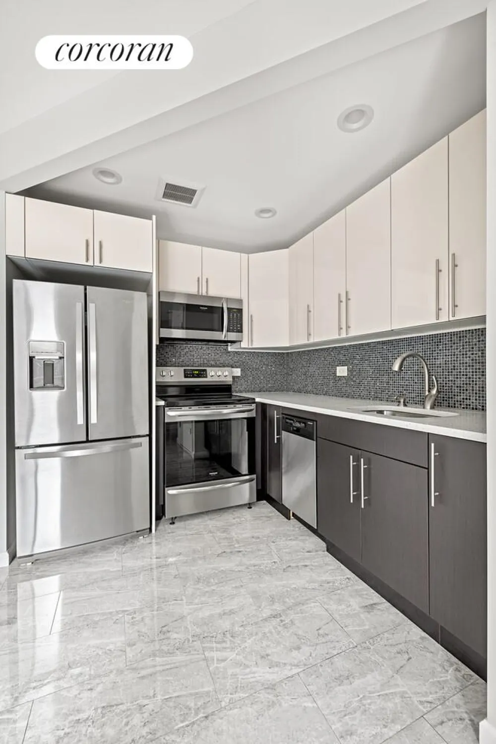 Upon entering, you are greeted by a functional open layout that maximizes space and natural light. The two-tone modern kitchen is a culinary enthusiast's dream, featuring stainless steel appliances and a vented design that ensures a comfortable cooking experience. Porcelain tile floors extend throughout the unit, complemented by heated floors that provide warmth and comfort during the colder months. The property is equipped with energy-efficient split units, offering customizable climate control for optimal comfort. The apartment is equipped with a combination LG washer and dryer for your convenience., allowing for easy laundry management without leaving the comfort of your home. The chic bathroom, highlighted by the grey and wood grain porcelain tiling, will comfortably pamper you.