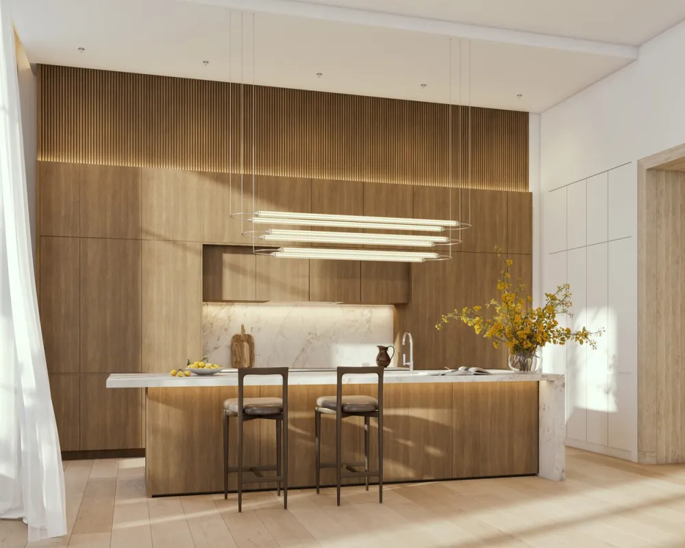 Residence Four is a 3 bedroom with a home office featuring expansive 10" White European oak flooring, paired effortlessly with flush bases and natural travertine stone surroundings for doors. With ceiling heights soaring up to an astounding 13'6", the expansive spaces radiate opulence. Floor-to-ceiling French doors bathe great rooms in natural light, and bedrooms, feature monumental, simulated double-hung windows for an unmatched living experience. Indulgences extend even further with en-suite night bar in primary suites and fully equipped laundry rooms, featuring sinks and large-capacity washers with vented dryers.