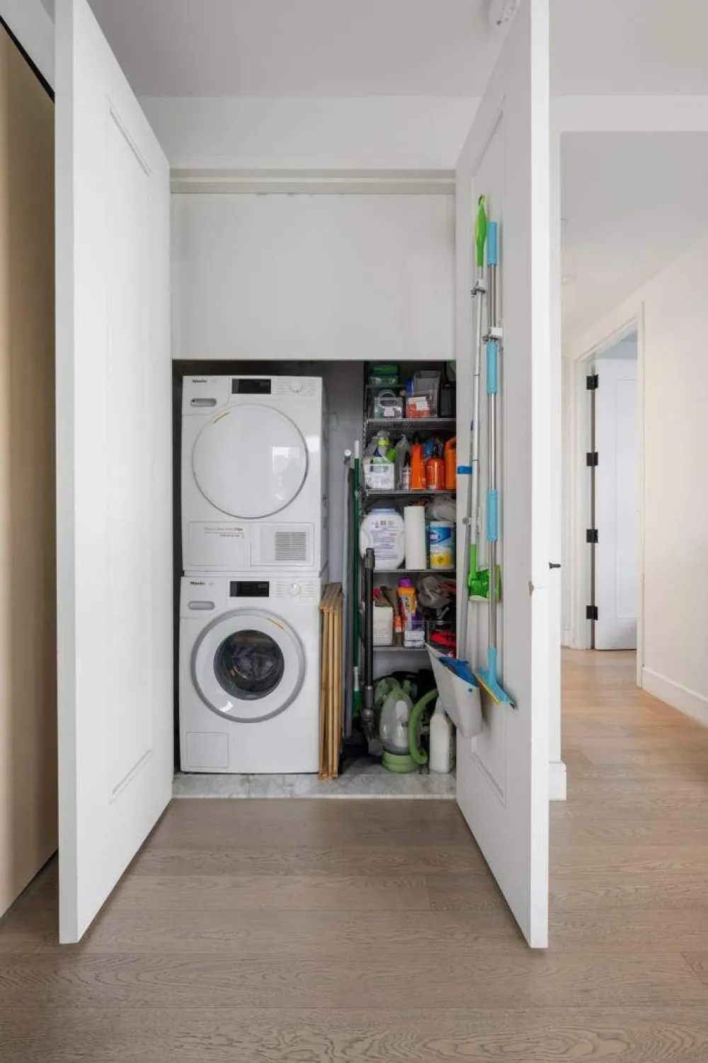 Soaring 10-foot ceilings and floor-to-ceiling Lami windows flood the home with natural light while ensuring energy efficiency with thermal insulation. Interiors are finished with wide-plank white oak floors, multi-zone climate control, and an in-unit Miele washer/dryer.