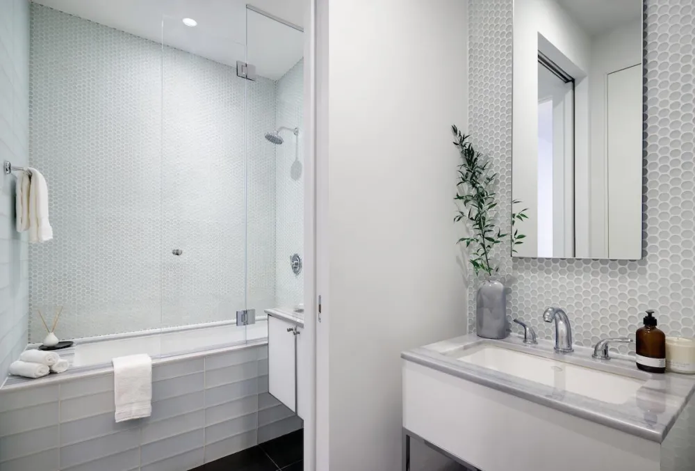 The spacious bedrooms comfortably accommodate a king-sized bed and offer a generous walk-in closet for optimal organization. Each bathroom is designed with luxury and comfort in mind, featuring elegant glass wall tiles, a full-size soaking tub, and double marble vanities with Waterworks crystal fittings.
