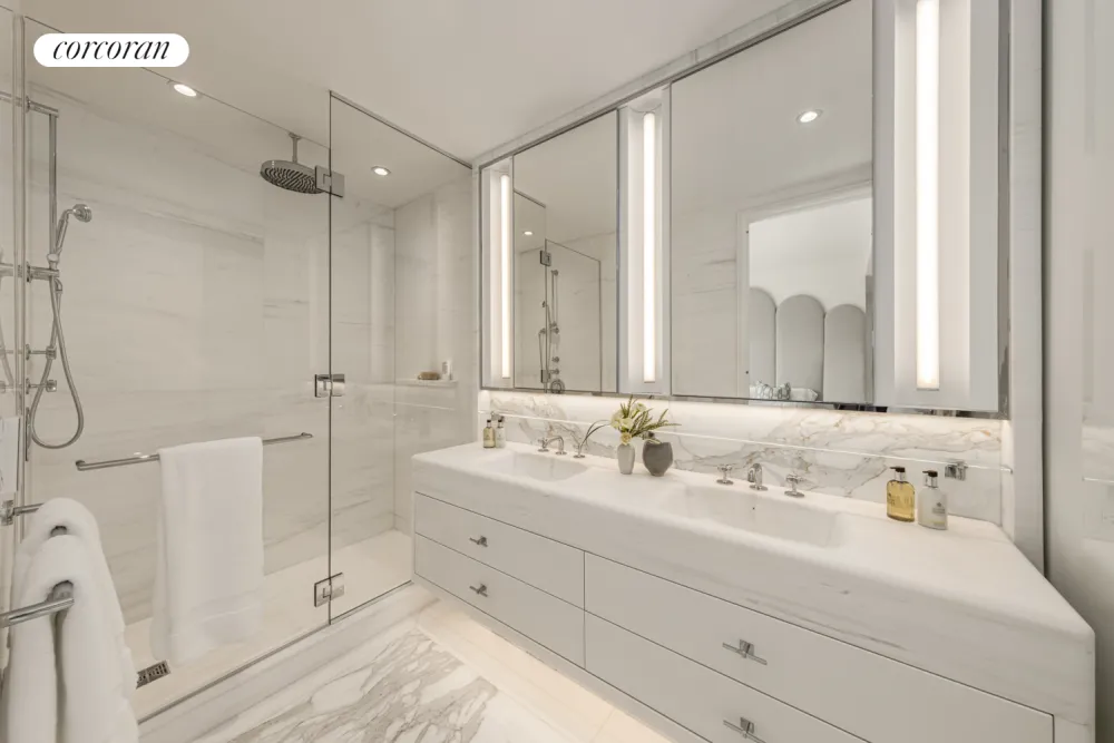 The south-facing primary bedroom boasts ample closet space, an en-suite bathroom elegantly ornamented with Bianco Dolomiti and Calacatta Gold marble, and Toto Neorest water closets. The secondary bathroom is embellished with an Italian custom-crafted lacquer wood vanity, honed cloudy mist marble floors and shower walls, glacier white Corian countertops with integral sink, and a Duravit water closet. Residence features include 5" solid oak plank quartered and rifted flooring, 4 pipe HVAC for year-round climate control..