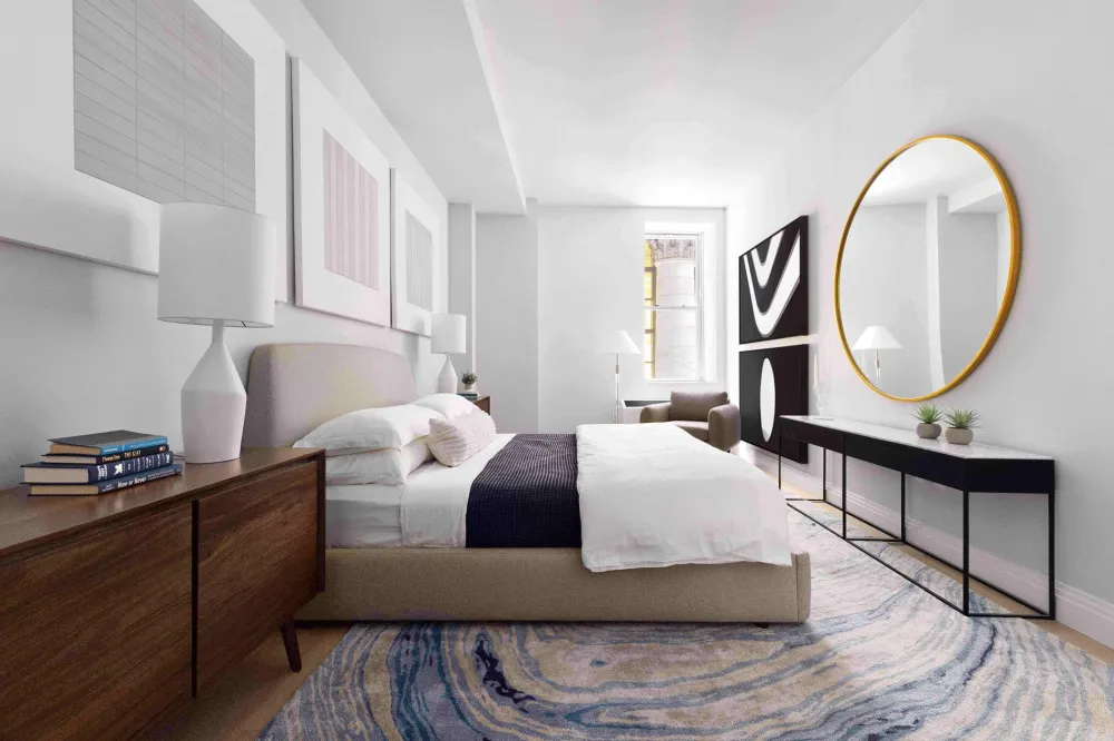 Warm stone primary bathrooms feature a soaking tub with thermostatic controls. Mirrored medicine cabinets are integrated with LED lighting and Bianco Dolomite marble surround. The building’s one-of-a-kind residences maintain the integrity and character of the 1930s scale, a modern take to art deco detailing, and boast ceiling heights over ten feet throughout with wide-plank French Oak hardwood floors underfoot.