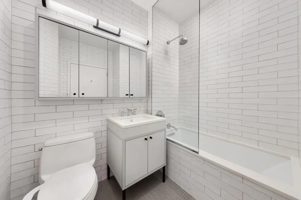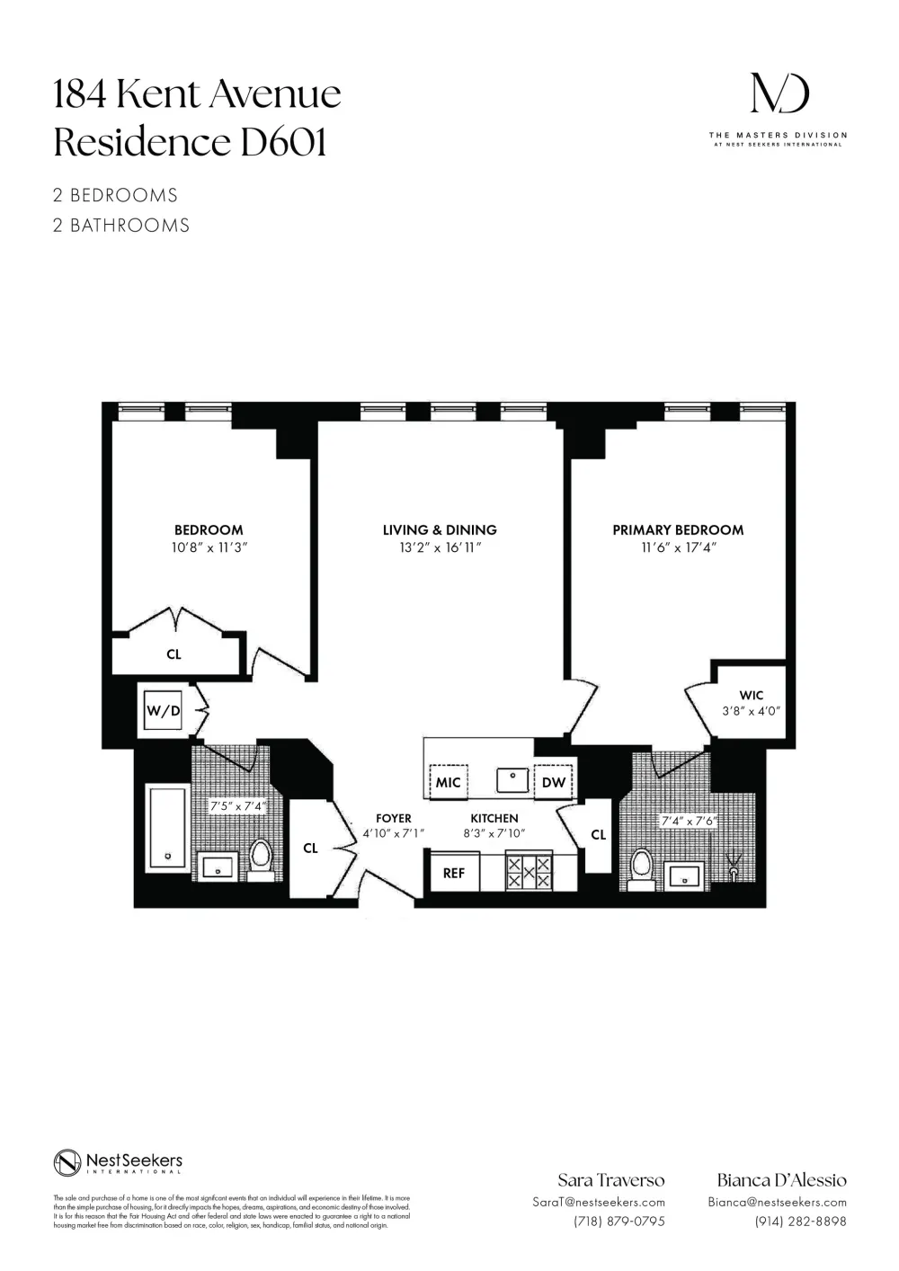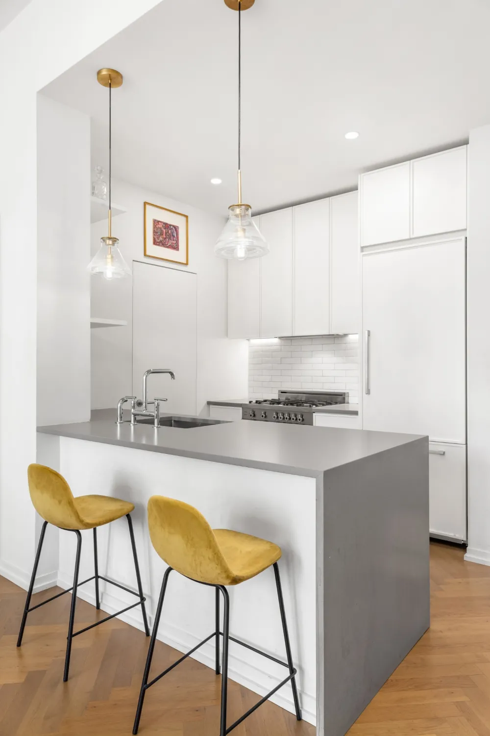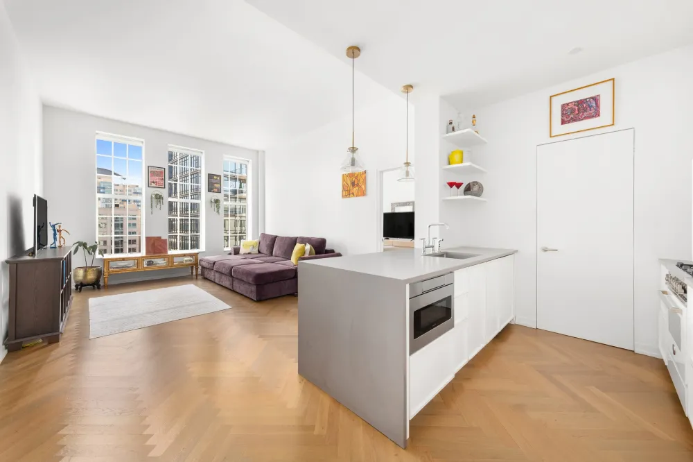 Perfectly positioned along the North Brooklyn waterfront, the iconic Austin Nichols House at 184 Kent Avenue in Williamsburg offers an extraordinary lifestyle defined by design, comfort, and history. This bright and generously sized split two-bedroom split two-bedroom home blends industrial charm with modern elegance, featuring soaring 11’8” beamed ceilings, refined finishes, and partial views of the water and Manhattan skyline visible from the living area. The expansive open living and dining space, framed by tall triple windows and herringbone-patterned tobacco-smoked oak floors, creates an inviting setting bathed in natural light throughout the day. The open chef’s kitchen is richly detailed and enhanced by brand new premium white matte-lacquered custom cabinetry, complemented by brushed Caesarstone concrete countertops, a hand-painted backsplash, Kohler Purist chrome fixtures, and a suite of top-grade appliances including a Bertazzoni 4-burner gas range, integrated Smart-tech Dacor refrigerator, Asko dishwasher, and Sharp microwave. The serene primary suite offers oversized double windows, a custom-built walk-in closet, and a spa-like bath adorned with Pietre D’Italia Nero mosaic flooring, honed Gioia Carrara stone walls, and a sleek glass-enclosed shower. The secondary bedroom, with generous closet space, sits privately on the opposite side of the home, adjacent to a second full bath with soaking tub and elegant finishes. A welcoming foyer with a large closet and in-unit washer/dryer completes this thoughtfully designed layout. Originally built in 1915 as a grocery warehouse, later repurposed as a bourbon distillery, and reimagined by renowned architect Morris Adjmi, Austin Nichols House is among the few landmarked buildings on the Williamsburg waterfront. Spanning an entire city block, it features over 30,000 sq ft of resort-style amenities including a waterfront fitness center, landscaped courtyard and roof deck, residents’ lounge with catering kitchen, co-working areas, children’s playroom, screening room, music rehearsal space, Zen garden with fire pit, and on-site garage. With full-time staff, a live-in superintendent, and direct access to the East River Ferry, North 5th Street Pier, and waterfront parks, this residence offers the very best of North Williamsburg living — where architectural heritage meets modern luxury.