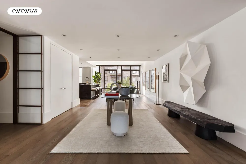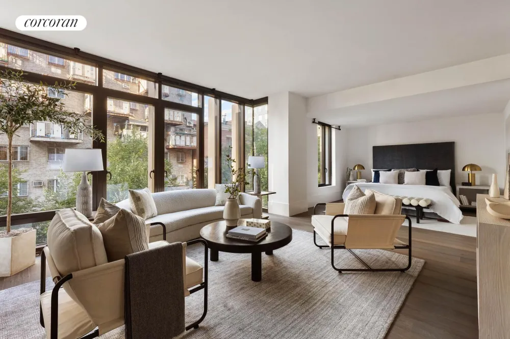 Step into an expansive great room that feels both intimate and infinite - framed by striking floor-to-ceiling gunmetal windows and graced with Northern and Southern exposures. Wide-plank oak floors lend warmth underfoot, setting the stage for unforgettable evenings and relaxed, soulful living.