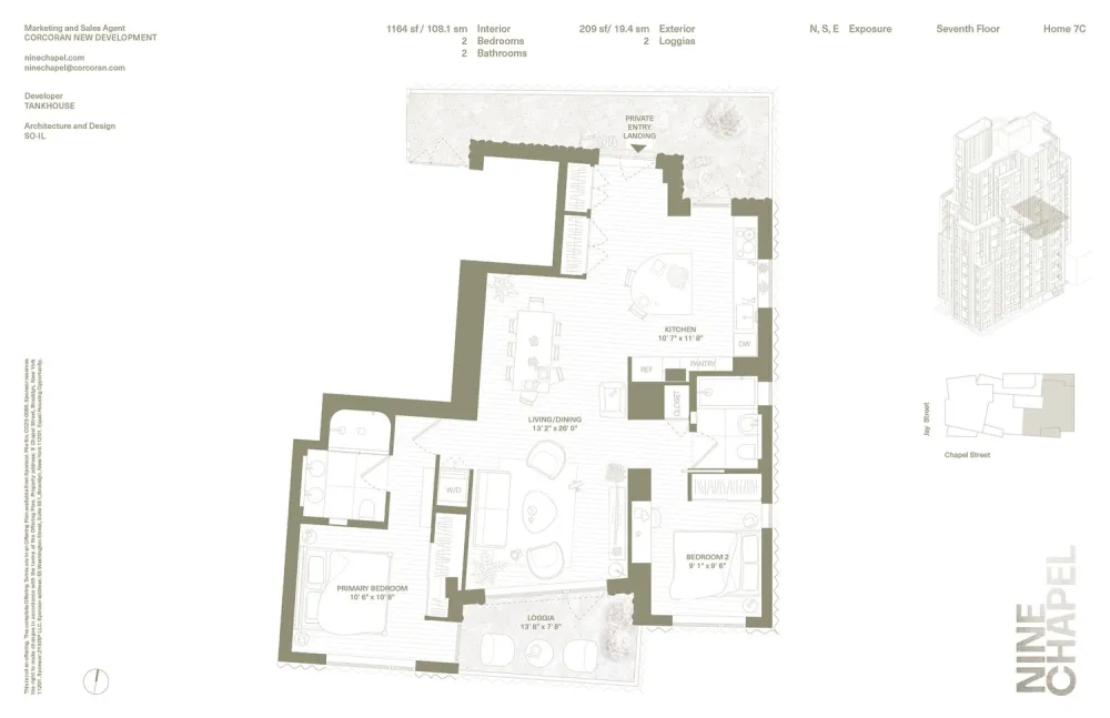 Arrival into Nine Chapel is via a landscaped walkway into a double-height lobby. The residences each have a dedicated, covered stoop-like entry landing, a functional extension of the homes" interiors. The innovative layouts provide each home the benefit of a corner unit, with every residence offering at least two exposures and abundant natural light through large picture windows.