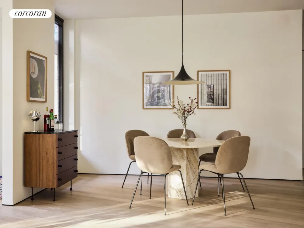 Residence 7C is a 1,164 SF, corner two bedroom, two bath home offering north, south and east exposures, a private entry landing, and covered loggia overlooking the neighboring cathedral. The loggia is framed by a beautiful, perforated screen, which allows light to filter in but provides added privacy and weather protection making it a true extension of the interior. The expansive great room allows for a large dining table, and generous living area with a wall of glass facing the loggia. The kitchen is the focal point, with its gorgeous organically shaped island functioning as an additional gathering space. The primary bedroom offers a full wall of closets, and a stunning en-suite bathroom with dual sinks and walk-in shower. The secondary bedroom has corner exposures, a built in desk and a windowed hall bath with a white glass mosaic tub/shower.