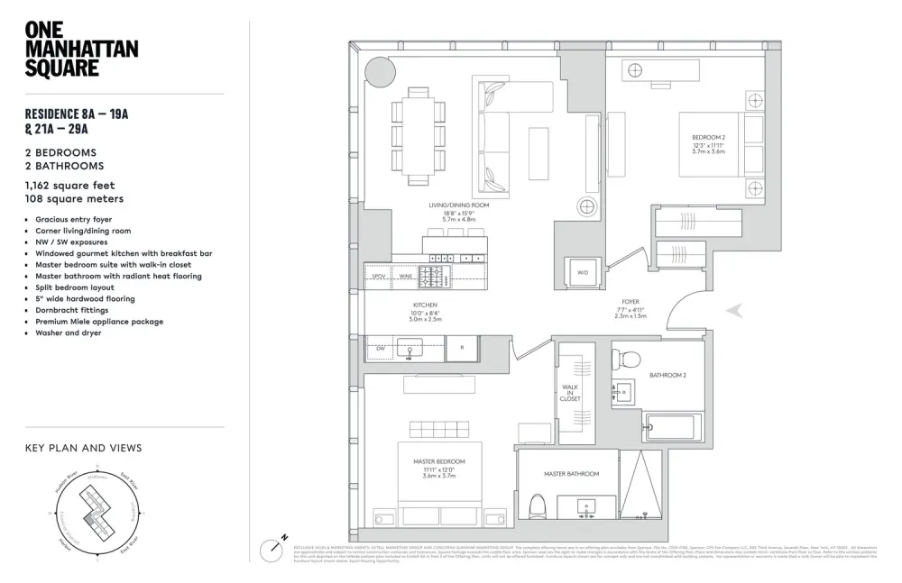 Residence 19A is a 1,162 square foot tow bedroom, two bathroom with an open gourmet kitchen and breakfast bar. This spacious corner residence faces North West and South West, with NY Harbor views and City Skyline. Warm, modern interiors are brought to life by the renowned design team at Meyer Davis Studio. This residence features imported stone and custom finishes, premium Miele appliance package, 5 wide stained oak flooring, master bath with custom wood cabinetry, marble tile walls and mosaic floors with radiant heat, undermount Wetstyle sink with glass vanity top and Dornbracht polished chrome faucets and a washer and dryer.