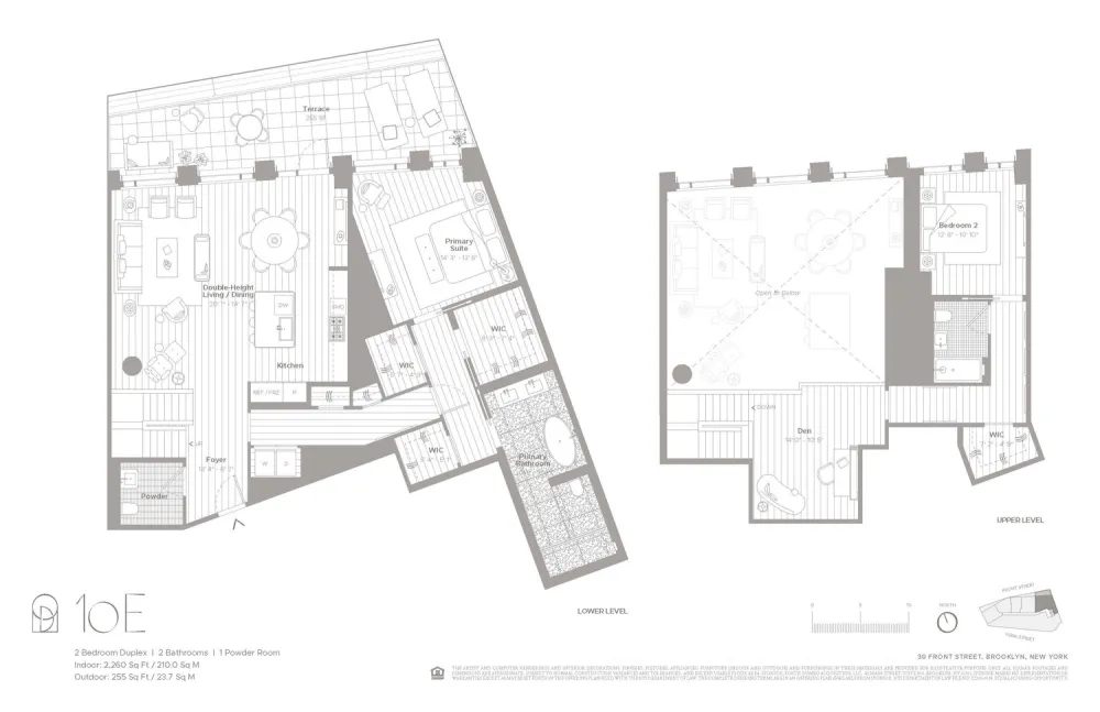 Introducing Duplex Residence 10E. With ceilings soaring up to 18', this two-bedroom, two-and-a-half-bathroom residence offers a 255 SF private terrace. Upon entry, the foyer introduces the light-filled, double-height living space. The impeccably tailored Workstead-designed kitchen merges exquisite detail with rich materials. Featuring a statement kitchen island with inlaid Fior di Bosco stone slab and chamfered edges, raked maple cabinetry and millwork paired with satin nickel hardware and top-of-the-line Gaggenau appliances, the kitchen proves an integral part of the generous open living and dining area with oversized windows that look on to the private terrace.