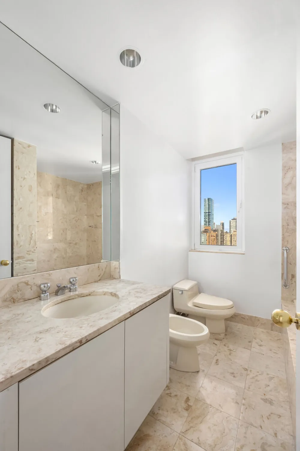 The sleek, galley-style kitchen is a functional masterpiece, equipped with stainless steel appliances, including a large refrigerator and gas range. It features rich wooden cabinetry and contrasting black granite countertops, offering a sharp, modern aesthetic. The apartment includes a generous sized bedroom, which features a bright, airy atmosphere and ample closet space along with the same stunning city views. Luxury extends to the windowed bathrooms, both finished in beautiful marble. The powder bath features dramatic brown marble flooring and wainscoting, creating a warm, bold look, while the primary bath utilizes light, warm-toned marble, a large vanity, and conveniently includes a separate bidet.