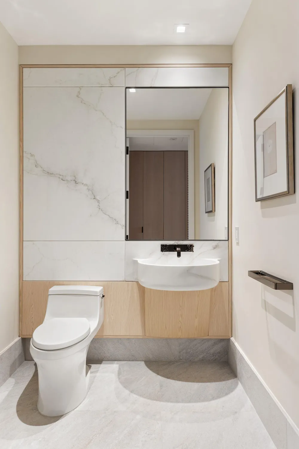 The primary bedroom has a spacious walk-in closet and en-suite bathroom with radiant heated honed white striated marble floors, porcelain tile walls, double sinks, custom sycamore vanity cabinets, integrated medicine cabinets, a walk-in rain shower, and a deep soaking tub. The second bedroom has a full en-suite bathroom with honed Arabesque marble floors, floating vanities, and Hansgrohe fixtures. An in-unit Miele washer/dryer, custom millwork, and energy efficient electric heating and cooling with variant refrigerant flow complete this home.