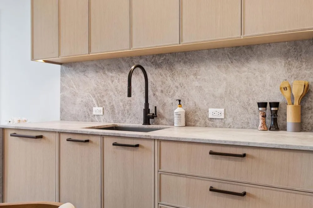 The kitchens are a chef's dream, equipped with Lineadecor premium woodgrain veneer custom cabinetry and stunning woodgrain white stone countertops and backsplash. Stylish Edwin LED linear suspension lighting in urban bronze illuminates the space, while top-of-the-line BOSCH appliances with custom seamless panels—including a built-in custom panel refrigerator, convection oven, freestanding multi burner gas range, smart built-in dishwasher, built-in microwave drawer, and integrated slide-out style range hood—ensure both functionality and sophistication. Rohl and Kohler faucets and fixtures add a touch of refinement, making cooking and entertaining a true pleasure.
