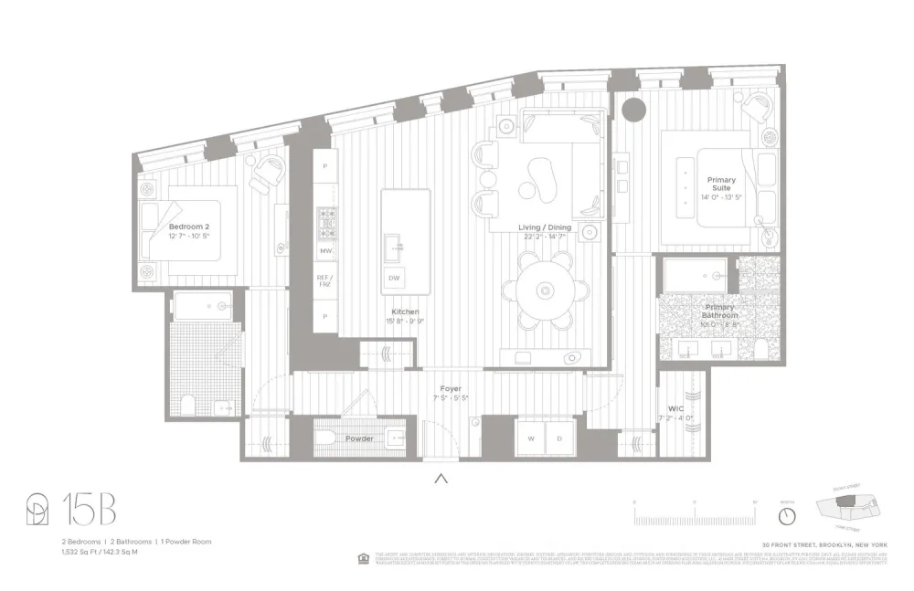 Offering views of Front Street in the heart of historic Dumbo, Residence 15B is the definition of reimagined luxury. This two bedroom, two-and-a-half bathroom residence with 1,532 SF of interior space is the perfect home for elegant living.