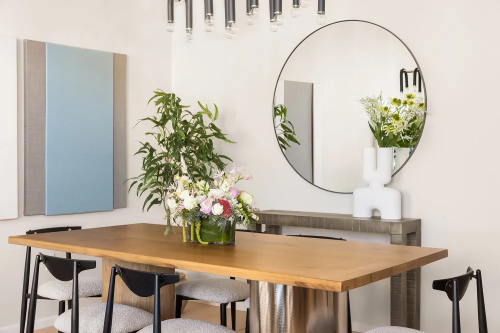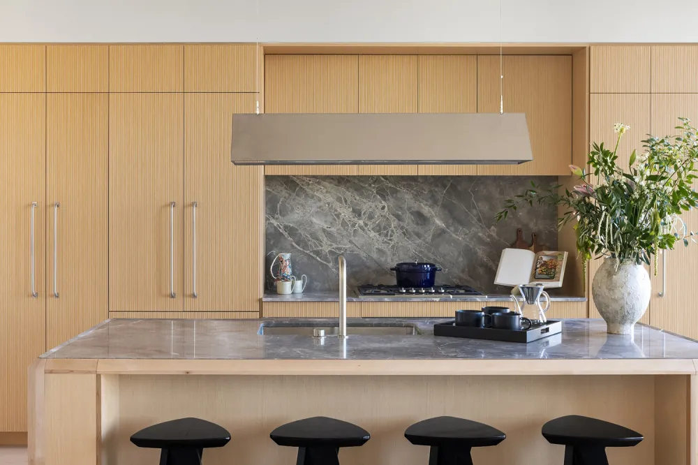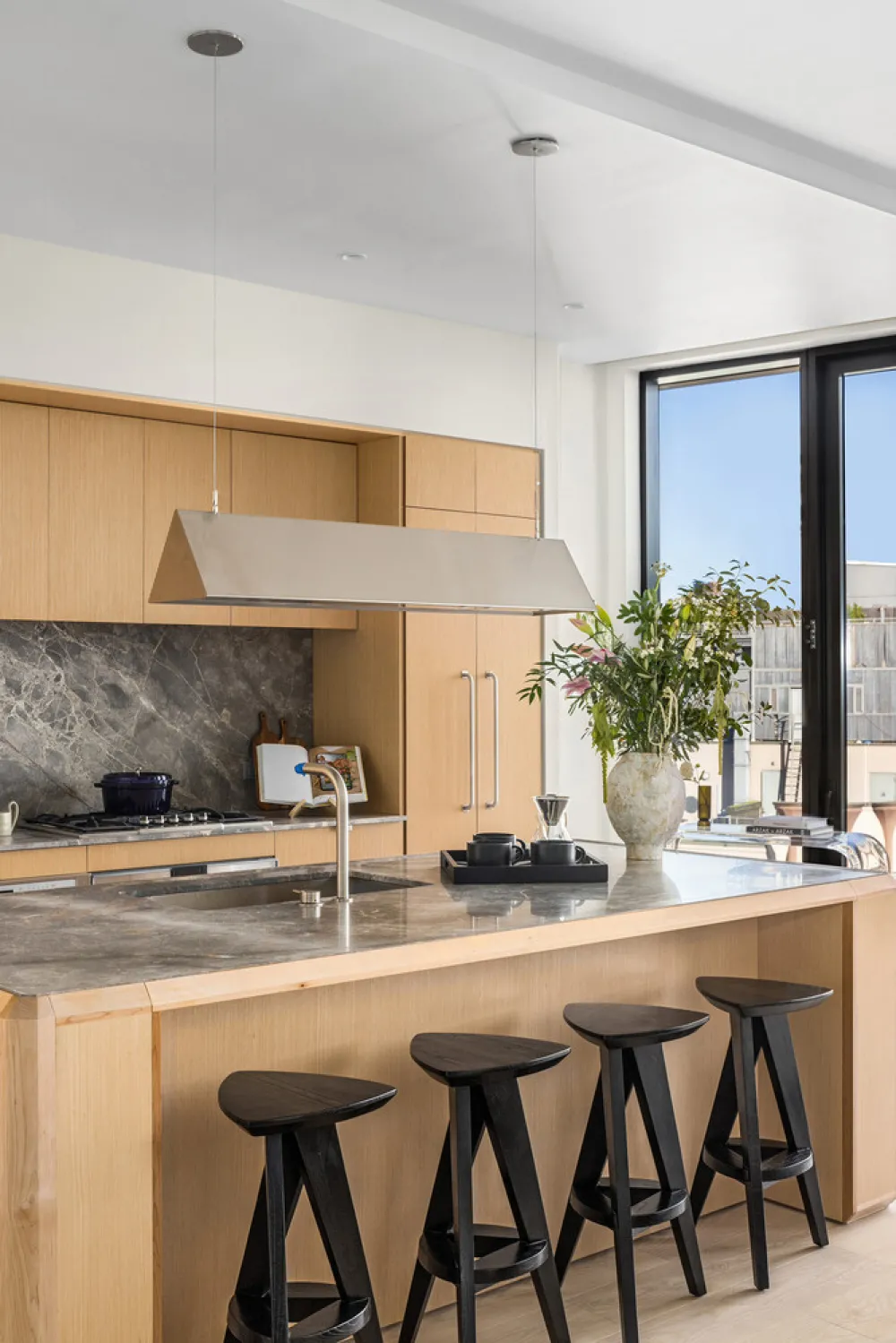 The centrally located foyer provides discrete entrance hallways to each of the bedroom suites and the central open plan living/dining area. The Workstead-designed kitchen merges exquisite detail with rich materials and features a beautifully crafted island with inlaid Fior di Bosco stone slab and chamfered edges, raked maple cabinetry paired with satin nickel hardware and Gaggenau appliances.