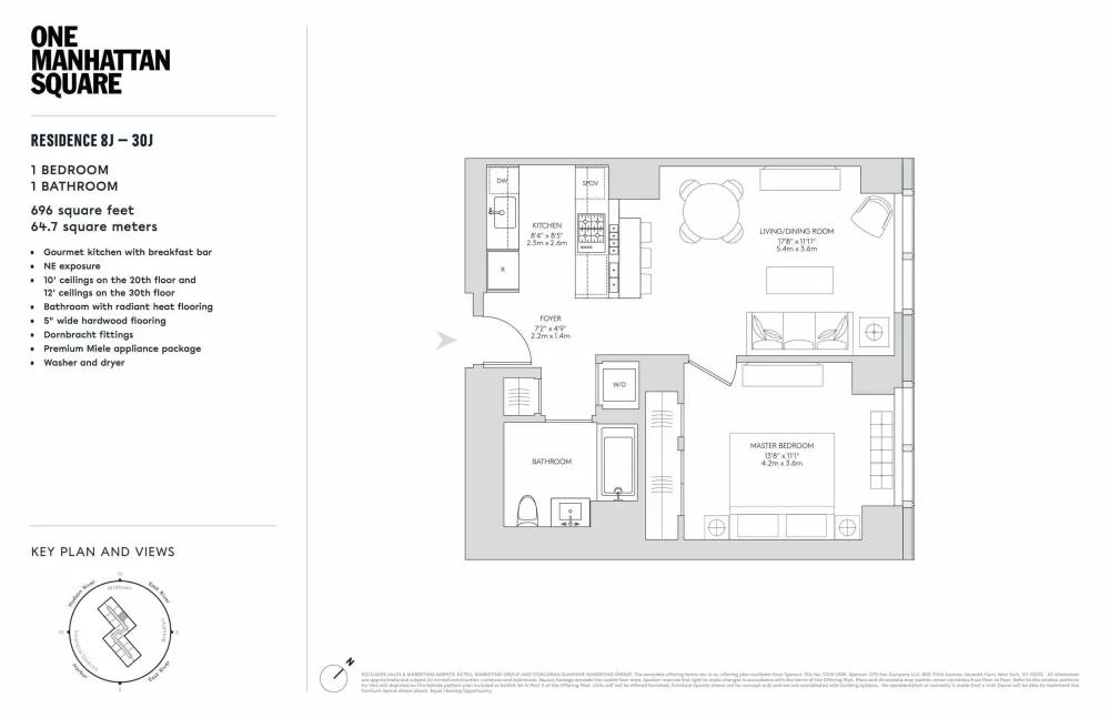 Residence 22J is a 696 square foot one bedroom, one bathroom with an open gourmet kitchen and breakfast bar and This spacious residence faces North East with East River and Williamsburg Bridge views. Warm, modern interiors are brought to life by the renowned design team at Meyer Davis Studio. This residence features imported stone and custom finishes, premium Miele appliance package, 5' wide stained oak flooring, master bath with custom wood cabinetry, marble tile walls and mosaic floors with radiant heat, under-mount Wetstyle sink with glass vanity top and Dornbracht polished chrome faucets and a washer and dryer.