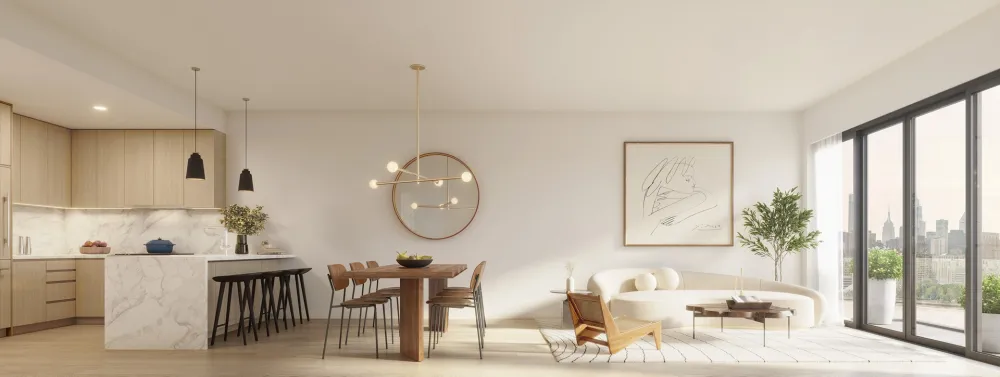 Waterfront Penthouse at Marina Astoria Boasting chic finishes, a private rooftop terrace, and close proximity to public transportation, lush parks, and dozens of restaurants, cafes, bars, and shops, this brand new 2-bedroom, 2-bathroom penthouse is a portrait of contemporary city luxury. Floor-to-ceiling triple-pane windows let in an abundance of natural light while keeping interiors quiet and temperature-stable. Wide plank oak floors run throughout an open-concept floorplan that maximizes square footage. Solid core doors feature smart lock hardware, and Nest-controlled heating and cooling offers precision temperature control and optimizes energy efficiency. The terrace is perfect for urban gardening, sun lounging, alfresco dining, entertaining, and more. There is also a convenient in-unit washer/dryer. A welcoming foyer adorned with a coat closet leads into an open plan living room, dining room, and kitchen saturated with southern and western light. The kitchen is equipped with an eat-in island, chic quartz countertops and backsplash, custom soft-close cabinets and drawers, a sleek Grohe faucet, a Liebherr wine fridge, and high-end fully integrated appliances from Miele. Spacious and bright, the primary bedroom receives vibrant eastern light and has a huge walk-in closet and a sumptuous en-suite bathroom with a custom oak vanity, a Toto toilet, polished chrome Grohe fixture, and a glass-enclosed walk-in shower. The second bedroom has a built-in reach-in closet and easy access to a second full bathroom with a custom oak vanity, a Duravit wall-mounted toilet, and polished chrome Toto fixtures. The Marina Astoria is a brand new luxury waterfront condominium nestled in one of the most culturally vibrant neighborhoods in the entire city. With incredible amenity spaces and quick access to Astoria’s main pedestrian strips, Marina Astoria offers residents a best-of-both-worlds living experience. The building has a landscaped courtyard, fitness center, library, pet spa, co-working space, meditation room, children’s playroom, and a furnished rooftop terrace with picturesque skyline views. There is also on-site parking, private storage, and a bicycle room. Broadway and 30th and 31st Avenues are thronged with eateries and nightlife options. Hallet’s Cove Beach, Socrates Sculpture Park, Rainey Park, and The Noguchi Museum are all just down the street, and the athletic fields and public pool in Astoria Park are a few blocks away. Public transportation options include the NYC Ferry and the N/W subway lines. Pets are welcome. The complete offering terms are in an offering plan available from the Sponsor. File No. CD21-0329. Sponsor: 3005 Vernon Blvd Joint Venture LLC, 3901 Main St, Suite 501 Flushing, New York 11354.