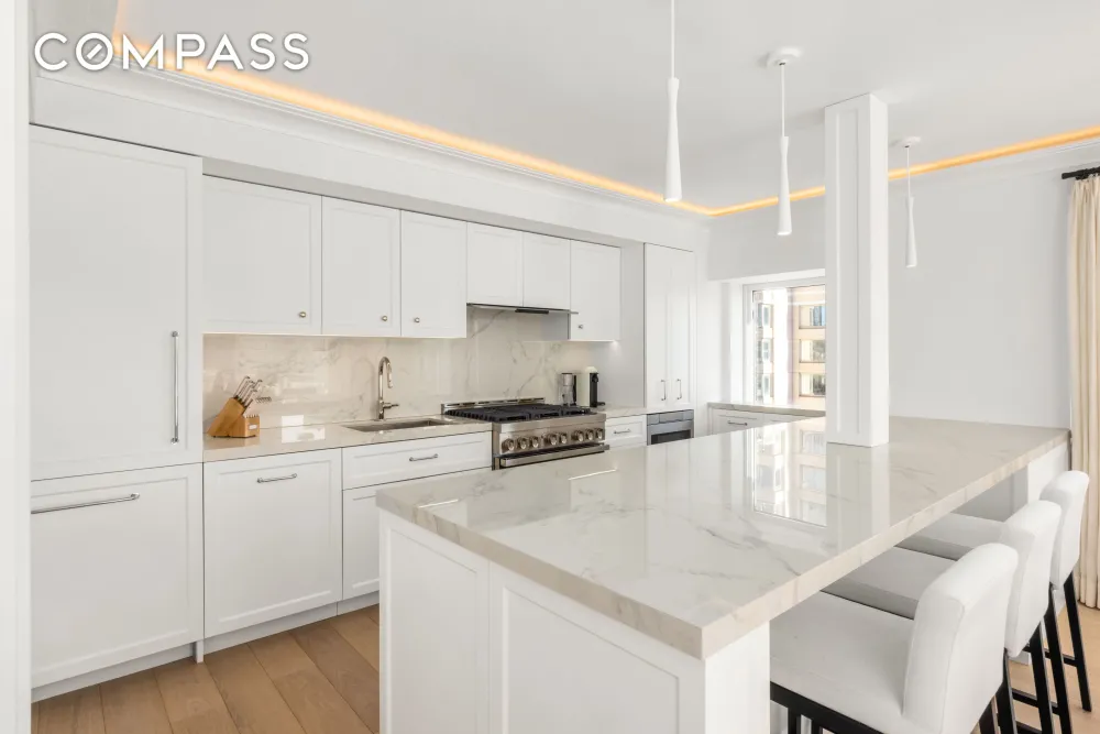 Poised high above the city in the renowned Imperial House, Residence 18S is an exquisitely reimagined corner home where impeccable craftsmanship meets Upper East Side sophistication. Spanning approximately 1,850 square feet and wrapped in luminous south and east exposures, this fully gut-renovated two-bedroom, two-bath residence was thoughtfully transformed by the acclaimed architecture and design firm Workshop APD, who collaborated with the homeowners to craft a gracious, contemporary home that balances warmth, luxury, and timeless Upper East Side elegance.