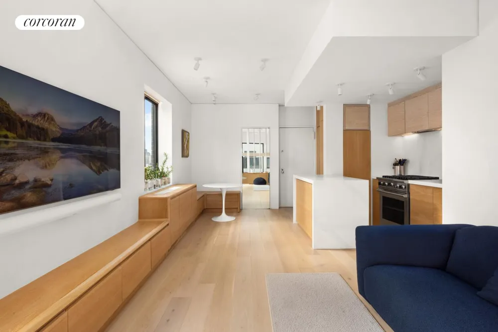 The open living and dining area boasts expansive southeast-facing windows that usher in all-day natural light and showcase beautiful open views of Downtown Manhattan. The airy layout is complemented by custom built-ins, refined architectural details, and a warm, modern aesthetic that feels both sophisticated and inviting.