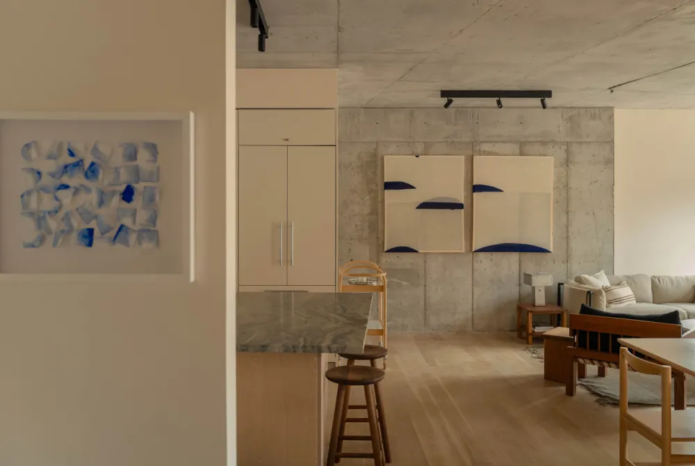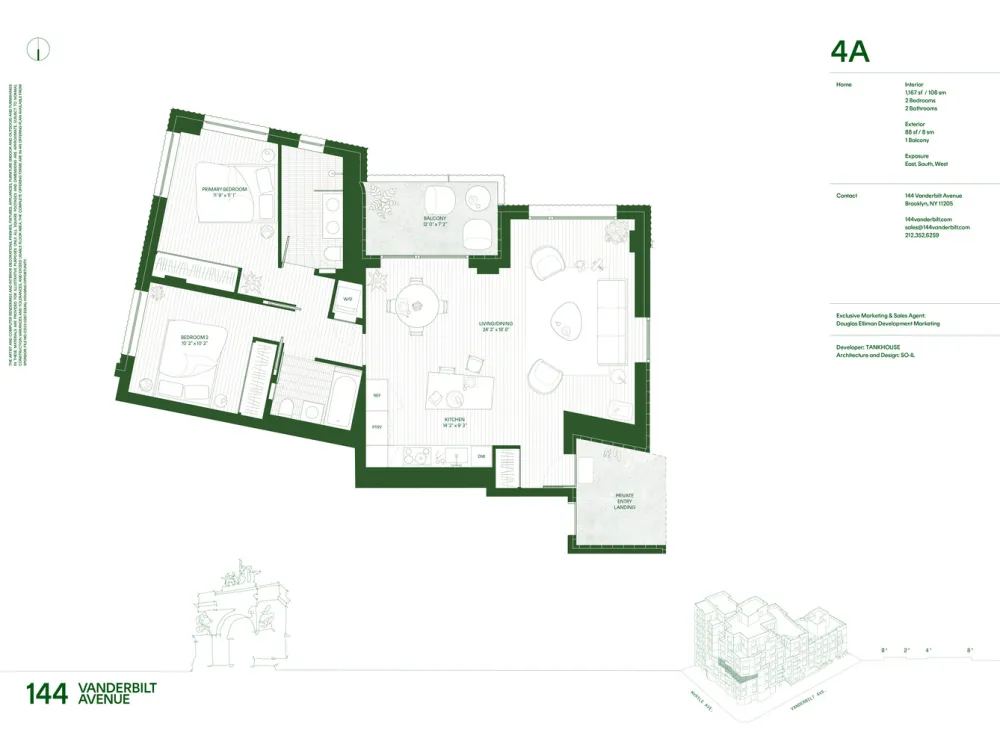 Corner Residence 4A comprises 1,167 SF, offering two bedrooms, two bathrooms, and East, South, and West exposures. Upon arrival through a separate entry landing, white oak floors, exposed concrete ceilings and natural lighting from the large South- and East-facing windows in the living/dining area set the tone for modern, design-forward living.