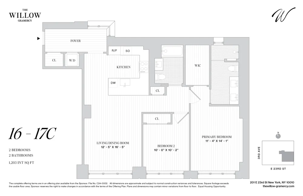 CLOSINGS COMMENCE THIS SPRING. 65% Sold. Residence 17C is a charming two-bedroom, two bathroom home. With expansive south-facing windows, the apartment is filled with natural light, highlighting the elegance of the wide-plank oak flooring throughout. A private windowed foyer leads into the thoughtfully designed space, featuring an open concept kitchen, living, and dining area. The kitchen, beautiful and carefully designed, is open to the living area but set back to maintain separation. The primary bedroom suite feels private and luxurious with generous closet space and a double vanity in the windowed bathroom. A full size washer and dryer complete this special two bedroom home.