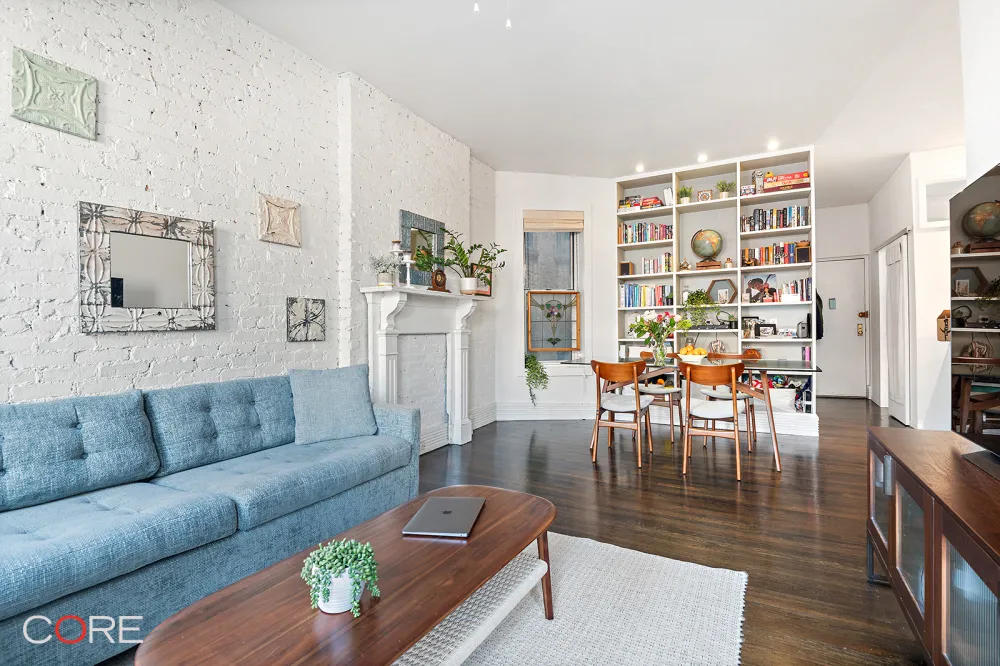 Sunlight pours through windows facing north, east, and west, illuminating the home with wonderful natural light and framing serene, tree-lined views. The apartment is packed with pre-war and custom details, including high ceilings, exposed brick, a wall of built-in bookshelves, recessed lighting, and built-in speakers for music in every room.